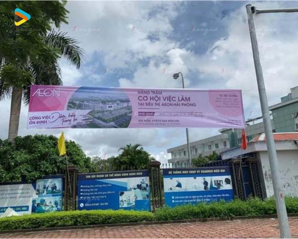 Mẫu banner này xuất hiện trên con đường lớn, trước cửa hàng hay trung tâm thương mại, nơi mà có nhiều người qua lại. Mẫu banner quảng cáo ngoài trời có kích thước lớn, chất liệu bền bỉ, có khả năng chịu được nắng mưa. Mục dích của quảng cáo banner là có khả năng thu hút sự chú ý nhanh, giúp truyền tải thông tin của sản phẩm, chương trình khuyến mãi…