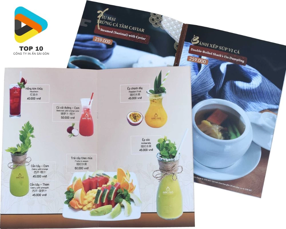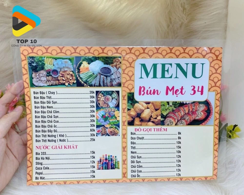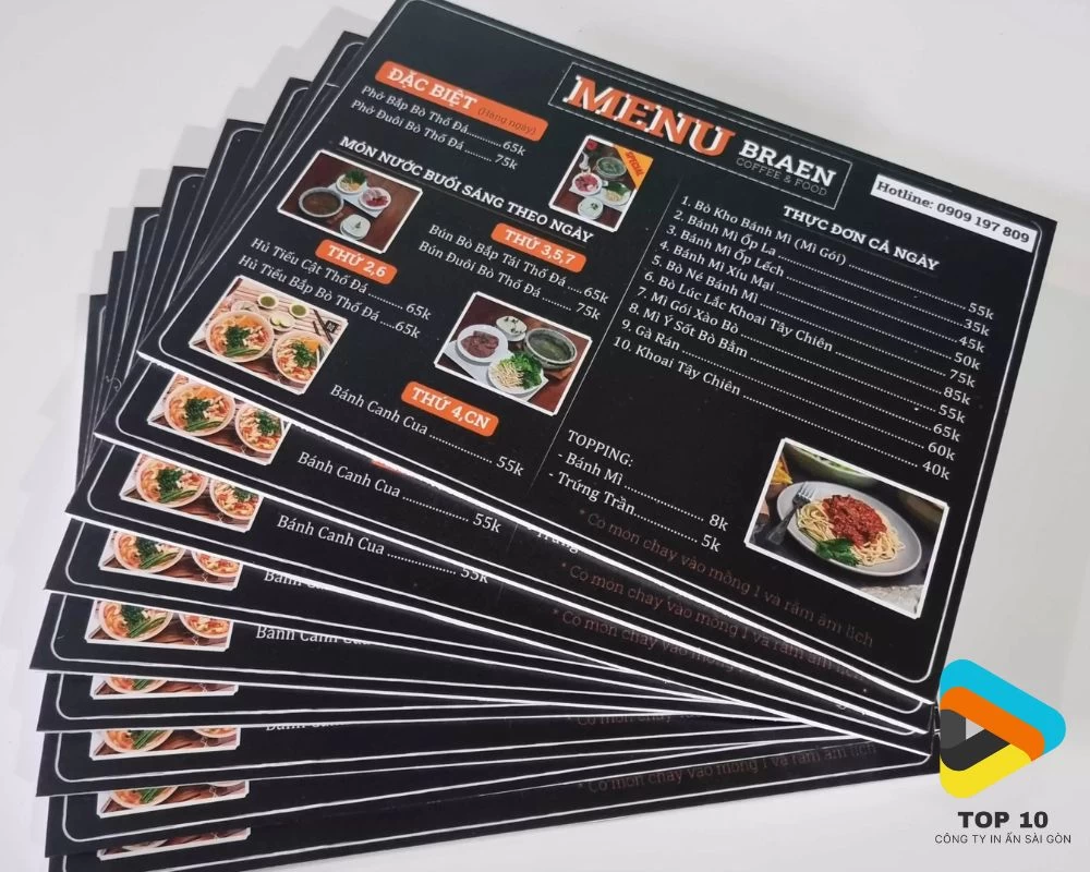 Trước hết, hãy đảm bảo thiết kế file ở hệ màu CMYK với độ phân giải tối thiểu 300dpi nhằm đảm bảo hình ảnh món ăn rõ đẹp và không sai màu khi in. Việc sử dụng chất liệu màng cán thích hợp như màng mờ, màng nhung hay màng cát không những tăng tính thẩm mĩ mà còn có thể chống trầy xước và chống bám bẩn tốt.
