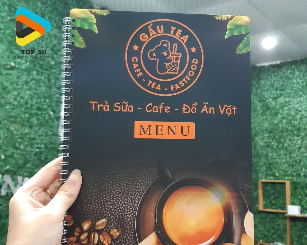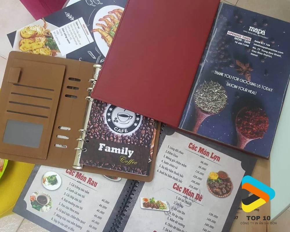 Ngoài ra, bạn nên xem xét kĩ các kiểu đóng gáy như gáy còng, gáy lò xo, gáy photobook để phù hợp với nhu cầu thay đổi menu của quán. Đừng quên yêu cầu xưởng in mẫu thử nhằm đánh giá độ cứng của bìa và chất lượng mực in trước khi sản xuất số lượng lớn. Việc áp dụng thêm các kĩ thuật tạo hình như ép kim logo hoặc bo góc kim loại sẽ giúp nâng cao thẩm mỹ và kéo dài tuổi thọ cho cuốn menu